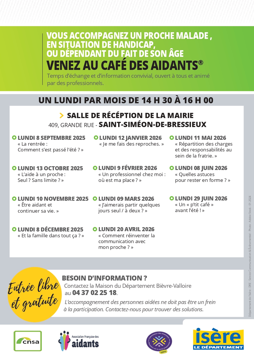 - Le café des aidants : Un lundi par mois, autour d’un café, venez échanger votre expérience avec d’autres aidants. Des professionnels vous accueillent un lundi par mois de 14h30 à 16h des Salle de réception de la Mairie, 409 Grande Rue 38870 St Siméon de Bressieux sans inscription et gratuit